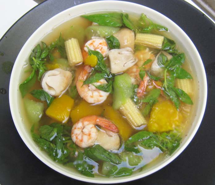 គ្រឿងផ្សំ៖ បង្គា ៣៥០ក្រាម បកសំបកអោយស្អាត, បន្លែមាន ល្ពៅ ស្នៀតពោត ននោង ស្លឹកបាស ផ្សិតចំបើង ត្រលាច ជីនាងវង … តាមចំណូលចិត្ត, ទឺក ៣កូនចាន, ខ្ទឹមក្រហម ៣-៥ដុំ, ម្រេច កាពិ ១ស្លាបព្រាកាហ្វេ, ទឹកត្រី ៣ស្លាបព្រាបាយ, ស្ករស ១ស្លាបព្រាបាយ។ វិធីធ្វើ៖ ដាក់ម្រេចបុកជាមួយខ្ទឹមក្រហម និងកាពិ បុកអោតម៉ត់ចូលគ្នា។ ដាក់ទឹកចូលឆ្នាំង ទុកមួយរំពុះ រួចដាក់គ្រឿងដែលបុកហើយចូល ទុកមួយរំពុះ។