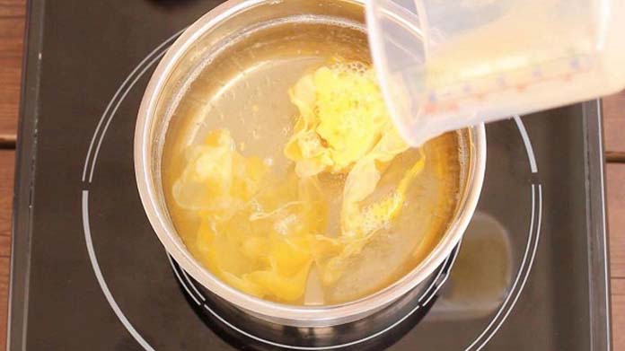 បន្ទាប់ស្រង់ស្លឹកតើយចេញ ហើយចាក់ពងមាន់ចូលល្បាយតិចៗឲ្យពេញឆ្នាំង កុំអោយដុំៗ រួចកូរចូលគ្នា។ លើកចេញពីចង្រ្កានចាក់ចូលចាន ឬពុម្ព ពេលដួសចាក់ចូលកូរផង កុំឲ្យពងមាន់ដុំៗ ទុកឲ្យវាត្រជាក់ ជាការស្រេច៕ ចុចមើលវីដេអូពីវិធីធ្វើនៅខាងក្រោម៖