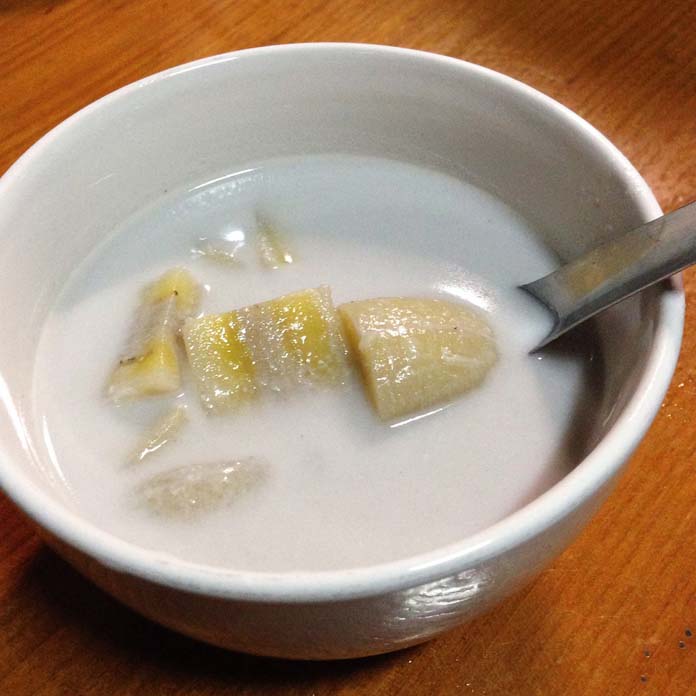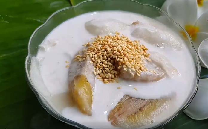 គ្រឿងផ្សំ៖ ចេក ៧-៨ផ្លែ, ស្លឹកតើយ ៣-៤សន្លឹក, ខ្ទិះដូង ៧៥០មីលីលីត្រ, ស្ករស ៣០០ក្រាម, អំបិល ១ស្លាបព្រាកាហ្វេ។ វិធីធ្វើ៖ បកសំបកចេក រួចកាត់ជាដុំ តាមចំណង់ចំណូលចិត្ត។ ដាក់ខ្ទិះដូង ស្ករស អំបិល និងស្លឹកតើយ ចូលឆ្នាំងកូរចូលគ្នាឱ្យសព្វ ទុករម្ងាស់ឱ្យពុះ។