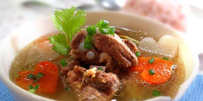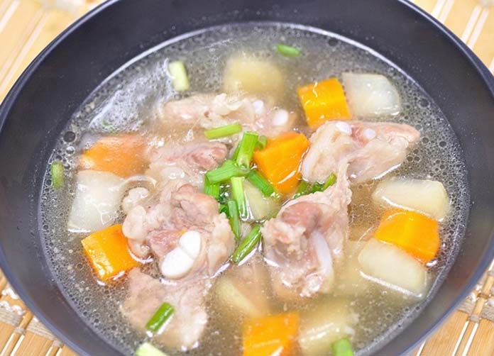 វិធីធ្វើ៖ ដាក់ទឹកចូលឆ្នាំងដាំមួយរំពុះ រួចដាក់ស្ករស ទឹកស៊ីអ៊ីវ ខ្ទឹមសបុកជាមួយម្រេចចូល កូរចូលគ្នា។ ដាក់ឆ្អឹងជំនី ការ៉ុតចូល រម្ងាស់ប្រហែល ១០-១៥នាទី។ ដាក់ត្រឡាចចូល រម្ងាស់ទៀតប្រហែល ១០នាទី រួចដាក់ដាក់ស្លឹកជី និងស្លឹកខ្ទឹមចូល ហើយដួសដាក់ចានជាការស្រេច៕ ចុចមើលវីដេអូពីវិធីធ្វើនៅខាងក្រោម៖