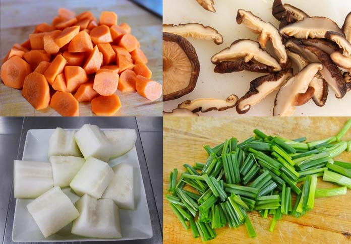 គ្រឿងផ្សំ៖ ឆ្អឹងជំនី ៣០០ក្រាម កាប់ជាដុំៗ, ត្រឡាច ៥០០ក្រាម កាត់ជាដុំល្មម, ការ៉ុត ១ផ្លែល្មម កាត់ជាដុំៗ, ផ្សិត ៨-១០ (ដាក់ក៏បានមិនដាក់ក៏បាន), ខ្ទឹមស ១០-១៥ និងម្រេចម៉ត់ ១ស្លាបព្រាកាហ្វេ បុកចូលគ្នាឲ្យម៉ត់, ទឹកស៊ីអ៊ីវ ៤ស្លាបព្រាបាយ, ស្ករស ១ស្លាបព្រាបាយ, ទឹក ១៥០០មីលីលីត្រ, ស្លឹកជី ស្លឹកខ្ទឹម។