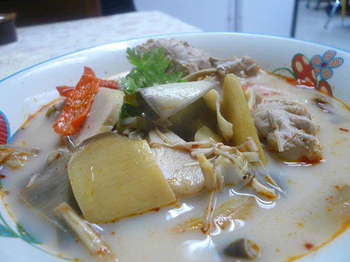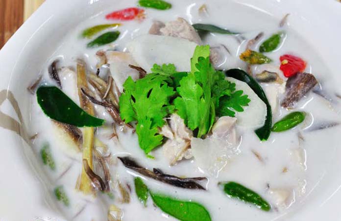 គ្រឿងផ្សំ៖ សាច់មាន់ ៥០០-៦០០ក្រាម កាប់ជាដុំៗ, ទឹក ៨០០មីលីលីត្រ, ដុំស៊ុប ១ដុំ, ត្រយ៉ូង ១ផ្លែល្មម, ខ្ទិះដូង ៨០០មីលីលីត្រ, រំដេង គល់ស្លឹកគ្រៃ ស្លឹកក្រូចសើច និងម្ទេសហាន់, ទឹកត្រី ១ស្លាបព្រាបាយកន្លះ, ស្ករស ១ស្លាបព្រាកាហ្វេ, អំបិល ១ចុងស្លាបព្រាកាហ្វេ, ក្រូចឆ្មារ និងជីស្ងោរជ្រក់ (ដាក់តាមចំណូលចិត្ត)។