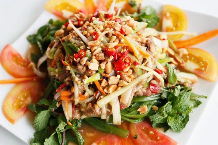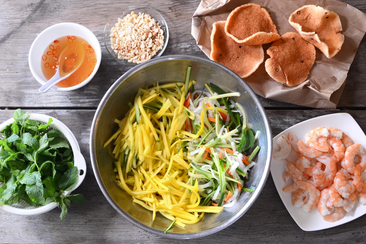 +គ្រឿងផ្សំ៖-ស្វាយខ្ចី (កោសជាសរសៃតូចៗ) ១ ចានចង្កឹះ-ខ្ទឹមក្រហម ២ដុំ (ហាន់ស្តើងៗ)-ម្ទេស តាមចំនូលចិត្ត (ហាន់ល្អិតៗ)-សណ្តែកដី ១ ស្លាបព្រាបាយ (បុកអោយម៉ត់តិចៗ)-ទឹកត្រី ១ ស្លាបព្រាបាយ-អំបិល បន្តិច