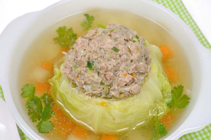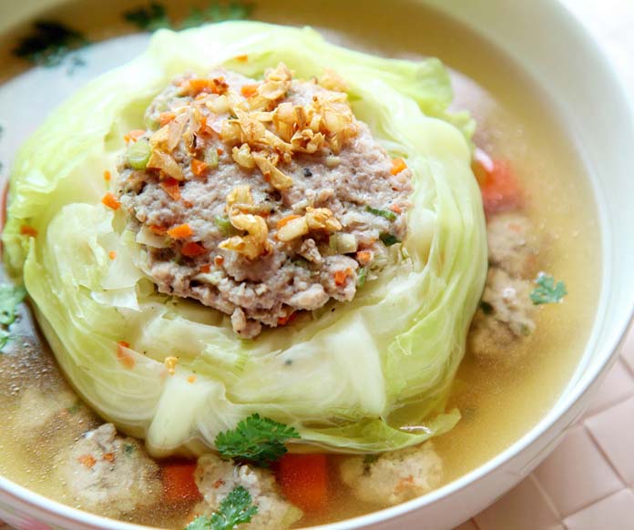 គ្រឿងផ្សំ៖ ស្ពៃក្តោប ២ផ្លែល្មម ទុកដាក់ស្នូល, ការ៉ុត និងឆៃថាវ ១ផ្លែល្មម កាត់ជាដុំៗ តាមចំណង់ចំណូលចិត្ត, ទឹកត្រី ៤ស្លាបព្រាបាយ, ស្ករស ១ស្លាបព្រាបាយ, អំបិល កន្លះស្លាបព្រាកាហ្វេ, ទឺក ១,៥លីត្រ។ គ្រឿងផ្សំស្នូល៖ សាច់ជ្រូកចិញ្រ្ចាំ ៣០០ក្រាម, មីសួរ ១ដុំ ស្រុះទឹកឲ្យទន់ រួចកាត់វែងល្មមៗ, ការ៉ុតចិញ្រ្ចាំ ឬហាន់ល្អិតៗ ២-៣ស្លាបព្រាបាយ, ស្លឹកខ្ទឹមហាន់ល្អិត ២ស្លាបព្រាបាយ, ខ្ទឹមស និងម្រេចបន្តិច បុកឬចិញ្រ្ចាំចូលគ្នា, ទឹកស៊ីអ៊ីវ ២ស្លាបព្រាបាយ។