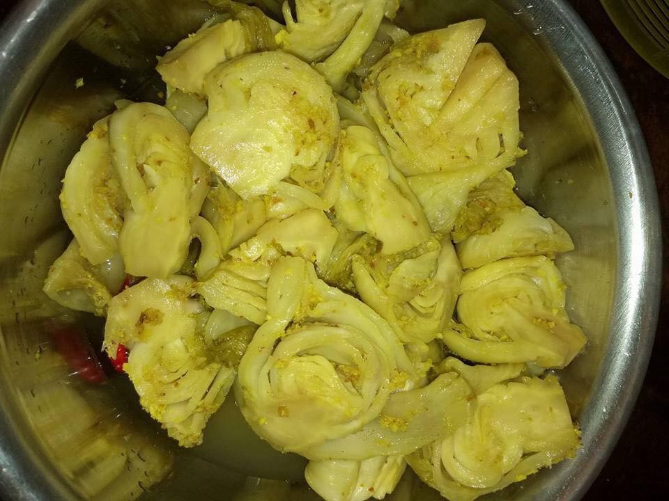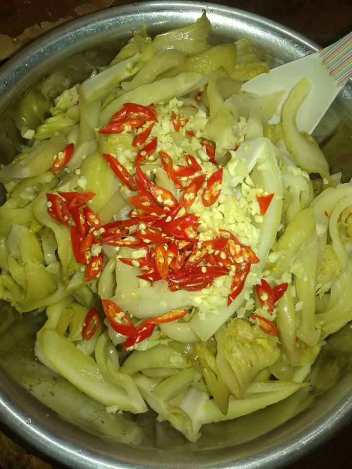 – ដាំទឹកក្តៅ (មិនបាច់ពុះទេ៧០-៨០អង្សា) យកស្ពៃមកស្រុស ២-៣នាទី ហើយស្រង់យកលាងទឹកត្រជាក់ រួចស្រង់ដាក់កញ្រែ្ចងទុកមួយឡែក។– បុករំដេង នឹងអំបិលគ្រោះ ចូលគ្នា (ដូចក្នុងរូប)។– ដាំទឹកស្ករស ១លីត្រ