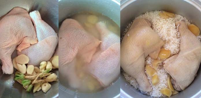 វិធីធ្វើ៖ យកឆ្នាំងដាក់ខ្ញី គល់ជីវ៉ានស៊ុយចូល ចាក់ទឹកចូល រួចដាក់សាច់មាន់ចូល ស្ងោរឲ្យឆ្អិន។ មាន់ឆ្អិនហើយស្រង់មាន់ចេញ រួចអង្ករដែលលីងហើយចូល ហើយដាក់សាច់មាន់ចូលពីលើ រួចចំហុយវាប្រហែល ២០-២៥នាទី។ លាយគ្រឿងផ្សំទឹកជ្រលក់ទាំងអស់ចូលគ្នា កូរឲ្យសព្វ។ ឆ្អិនរួចរាល់អស់ហើយ រៀបចំបាយមាន់ស្ងោរដាក់ចាន និងទឹកជ្រលក់ ជាការស្រេច ឆ្ងាញ់អស់ទាស់៕ ចុចមើលវីដេអូពីវិធីធ្វើនៅខាងក្រោម៖