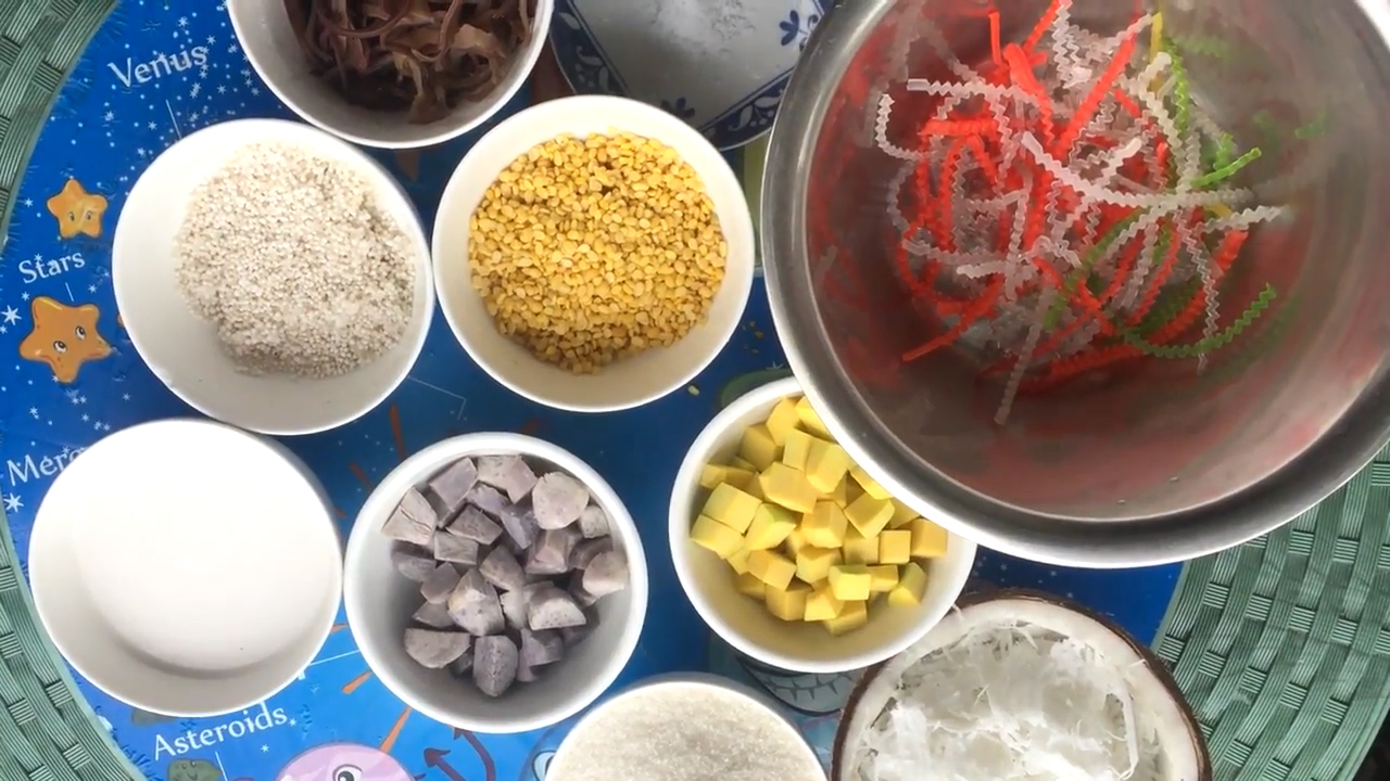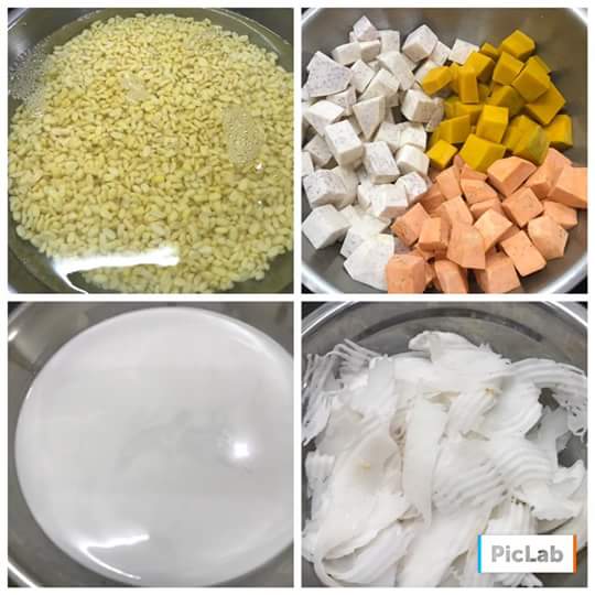 +គ្រឿងផ្សំ : -សណ្ដែកបាយ ១កំប៉ុងស្ទើរ -ខ្ទិះដូង កន្លះគីឡូ ខ្ទិះចុង ខ្ទិះដើម -ល្ពៅ ត្រាវ ដំឡូងជ្វា (៨ខាំ)-ដូងខ្ចី១កោសសាច់បាន -សណ្ដែកដី លីងឬស្ងោរអោយផុយ -គ្រាប់សាគូ១ខាំ ធ្មេញរណាកន្លះខាំ-ត្រចៀកកណ្ដុរ