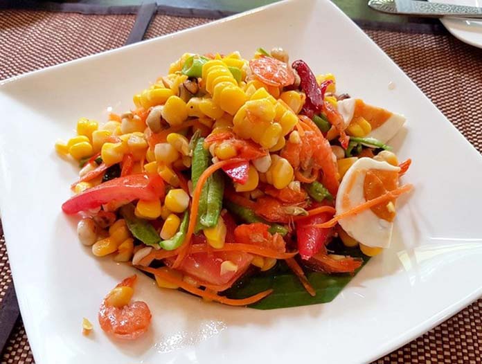 គ្រឿងផ្សំ៖ ពោត ១ផ្លែល្មម ស្ងោរឆ្អិនចិតយកតែសាច់, ការ៉ុត ១ផ្លែល្មម ឈូសឬសាប់ជាសរសៃតូចៗ, ប៉េងប៉ោះ ១ផ្លែ កាត់ជាដុំ, សណ្តែកកួរ ២-៣កួរ កាត់ខ្លីៗ, ពងទាប្រៃស្ងោរ ១គ្រាប់, ម្ទេស ៣-៥គ្រាប់ (តាមចំណូលចិត្ត) និងខ្ទឹមស ១-២កំពឹស, បង្គាក្រៀម សណ្តែកដី មួយមុខមួយស្លាបព្រាបាយ, ទឹកក្រូចឆ្មា ទឹកត្រី មួយមុខ ២ស្លាបព្រាបាយ, ស្ករ ១ស្លាបព្រាបាយ។