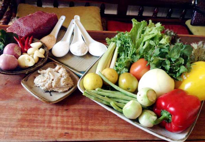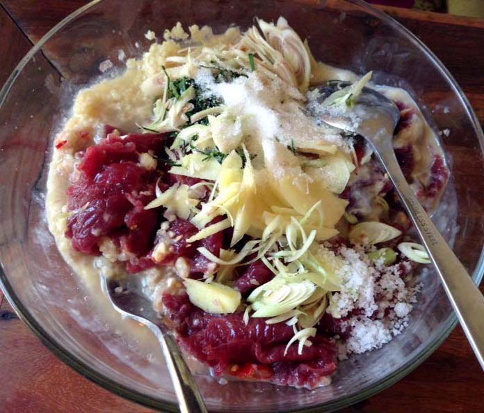 1-សាច់គោ យកសាច់គោល្អខ្ចី ហេីយផុយ(លាងទឹកអោយស្អាត ហាន់ជាបន្ទះស្ដេីងៗ )
