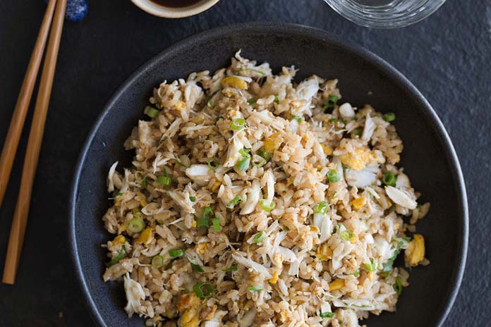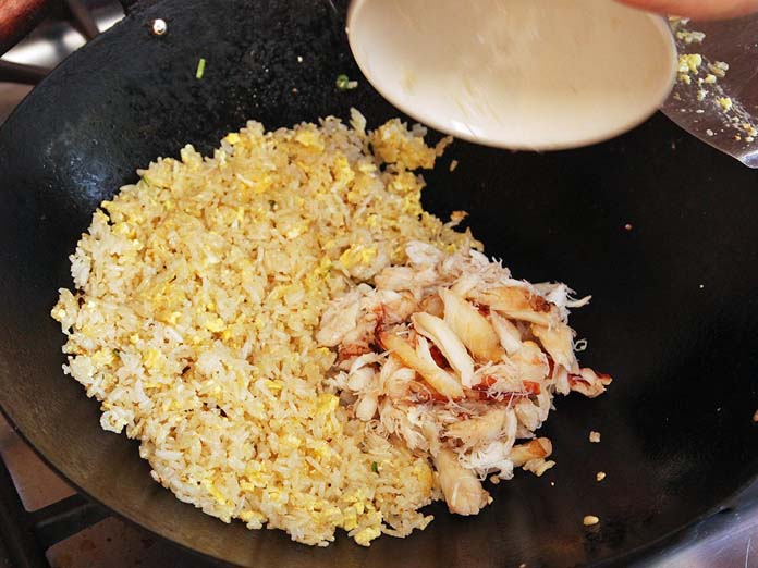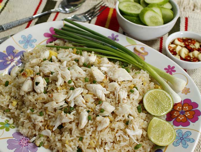 គ្រឿងផ្សំ៖ សាច់ក្តាម ១៥០ក្រាម, បាយ ២កូនចាន, ស៊ុត ១គ្រាប់, ខ្ទឹមបារាំងចិញ្ច្រាំ ៤ស្លាបព្រាបាយ, ខ្ទឹមសចិញ្រ្ចាំ ២ស្លាបព្រាបាយ, ប្រេងឆា ៤ស្លាបព្រាបាយ, ទឹកស៊ីអ៊ីវ ២ស្លាបព្រាបាយ, ស្ករស ១ស្លាបព្រាកាហ្វេ, ម្រេចម៉ត់ ១ចុងស្លាបព្រាកាហ្វេ, ស្លឹមខ្ទឹមហាន់តូចៗ ២ស្លាបព្រាបាយ។