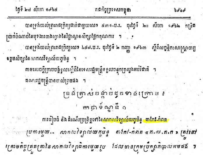 សូមបញ្ជាក់ថាឆ្នាំសិក្សាបើកដំបូងគី១៩៦៧ គីជាឆ្នាំដែលលោកគ្រូ ពូន សារឿន (អតីតនិស្សិតជំនាន់ទី១) ទើបជាប់ឌីប្លូម។មនុស្សច្រើនណាស់ដែលឆ្លល់ថាហេតុអ្វីបានជាសាកលវិទ្យាល័យនេះធ្វើនៅព្រំប្រទល់កំពត-តាកែវទៅវិញ? លោកគ្រូវបានឆ្លើយថា៖ ចាប់ពីក្រោយសង្គ្រាមលោកលើកទី២ (១៩៣៩-១៩៤៥) កាលនោះនៅស្រុកខ្មែរ ខេត្តទាំងអស់មានបារាំងជាចៅហ្វាយខេត្ត ប៉ុន្តែមានខ្មែរពីរៗនាក់ជាទីប្រឹក្សាដែលទទួលបន្ទុកផងដែរ។ នៅឆ្នាំ១៩៤៦ បារាំងបានដាក់ខេត្តតាកែវ និងកំពត ឱ្យទៅជាតំបន់តែមួយ។ ក្រោយមក ក៏មានវិទ្យាល័យមួយដែលមានឈ្មោះថា វិទ្យាល័យព្រះឧទ័យ