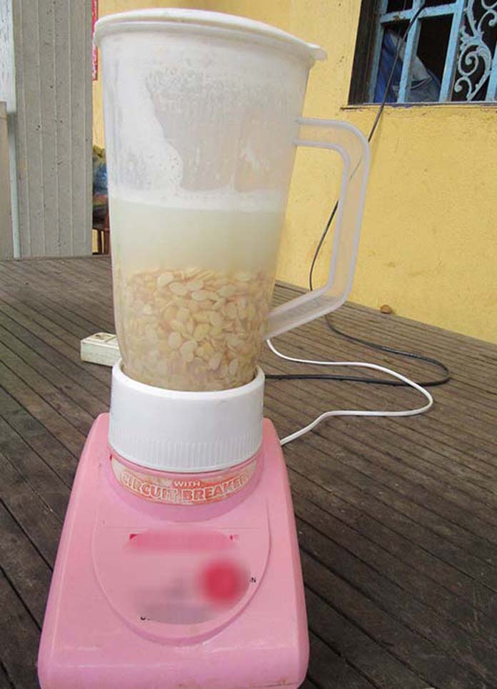 ២.ដួសសណ្តែកដាក់ចូលទៅក្នុងម៉ាស៊ីនក្រឡុក (ត្រូវចងចាំថានៅក្នុងការក្រឡុកម្តងៗគួរដាក់សណ្តែកទៅក្នុងម៉ាស៊ីនក្រឡុក ក្នុងបរិមាណសមស្របមួយ ដើម្បីកុំឱ្យម៉ាស៊ីនធ្វើការក្រឡុកតឹងតែងខ្លាំងពេក)។ ក្រោយពីម៉ាស៊ីនក្រឡុកម៉ត់ហើយ ត្រូវចាក់វាដាក់ទៅក្នុងក្រណាត់ស្អាត ដែលត្រៀមទុករួចជាស្រេច ដើម្បីច្របាច់យកទឹក និងកាកសណ្តែកចេញពីគ្នា។