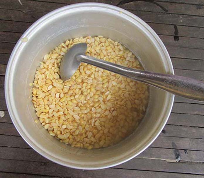 ១.ជាដំបូងត្រូវត្រាំសណ្តែកឱ្យរីកជាមុនសិន ដើម្បីងាយស្រួលយកវាកិន ដោយបងស្រីបានបញ្ជាក់ថា ត្រូវប្រើរយៈពេលត្រាំគ្រាប់សណ្តែក ប្រហែលជាពី៣-៤ម៉ោង។បន្ទាប់មកស្រង់គ្រាប់សណ្តែកដែលបានត្រាំនោះ មកលាងសម្អាតយកសំបកចេញ និងកំទេចកំទីនានាឱ្យបានស្អាត។