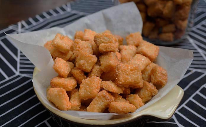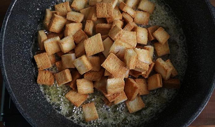 ១.យកនំបុ័ងកាត់ជាដុំតូចល្មម រួចយកទៅអាំង ឬចៀនឲ្យក្រៀមល្មម រួចដាក់ទុកមួយឡែក