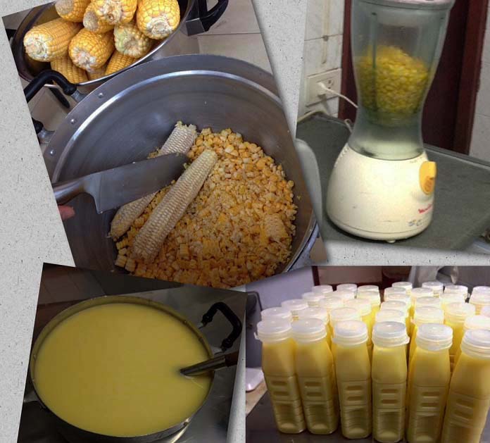 ២.បន្ទាប់មកយកពោតទៅកិន ជាមួយទឹកដែលស្ងោរពោត ២៥០មីលីលីត្រ ទឹកដោះគោស្រស់ ស្ករស និងអំបិល កិនចូលគ្នាឲ្យសព្វល្អ រួចចាក់ច្រោះកុំអោយដោយកាក