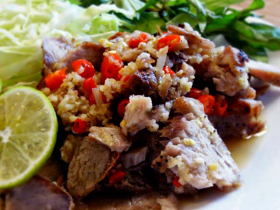 អាំងសាច់ជ្រូកអោយឆ្អិន ហើយហាន់ជាបន្ទះស្តើងៗ រួចទុកមួយអន្លើ។ ដើម្បីធ្វើជាទឹកសម្រាប់ញ៉ាំ យើងដាក់ ស្ករត្នោត ទឹកក្រូចឆ្មារ ទឹកត្រី ម្ស៉ៅស៊ុប ទៅក្នុងចានគោមមួយរួចកូរទាល់តែស្កររលាយ រួចដាក់ខ្ទឹមសចិញ្រ្ចាំចូល ជាមួយនឹងម្ទេស ភ្លក់មើលទៅតាមចំនង់ចំនូលចិត្ត តែគួរតែមានរសជាតិជូរ និងហិរ។ បន្ទាប់មកដាក់សាច់ជ្រូកអាំងដែលហាន់ហើយច្របល់ចូលគ្នាជាមួយទឹកញ៉ាំ ជាការស្រេច។