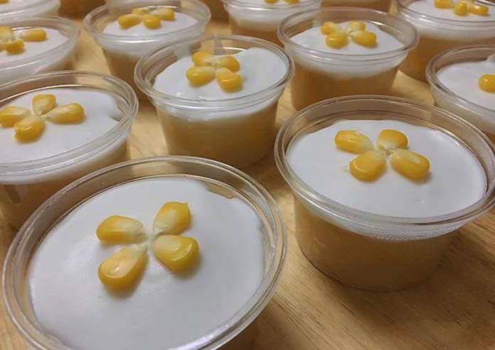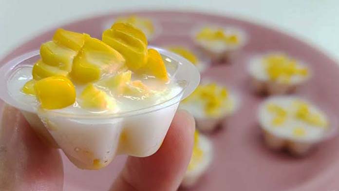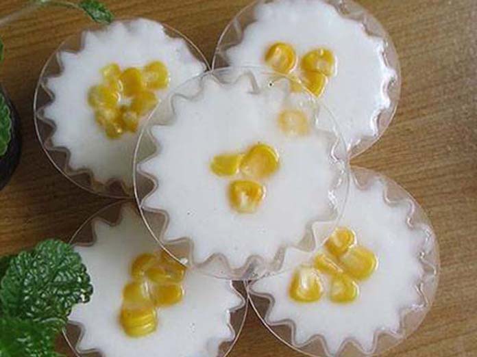 ២.រួចរាល់ហើយយកចាន ប្រអប់ កូនពែង ឬពុម្ព (តាមចំណូលចិត្ត) សម្រាប់ចាក់ចាហួយ យកពោតដាក់ចូល ហើយដួសទឹកចាហួយដាក់ចូល ទុកឲ្យត្រជាក់ជាការស្រេច៕