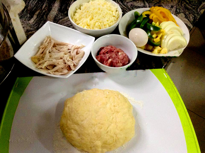 ម្ស៉ៅមី២ចានចង្កឹះ មេធ្វើនំប៉័ុង២ស្លាប់ព្រាកាហ្វេ ទឹកក្តៅអ៊ុនឭកន្លះចានចង្កឹះ ស្ករ១ស្លាបព្រាកាហ្វេ ប្រេងអូលាវ ពងទា២គ្រាប់ ទឹកប៉េងប៉ោះ ឈឹសPizza cheese ម្នាស់កន្លះផ្លែ ម្ទេសផ្លោកលៀងកន្លះផ្លែ ម្ទេសផ្លោកខៀវកន្លះផ្លែ សាច់ជ្រូក១ខាំ សាច់មាន់យកសាច់ទ្រូង ខ្ទឹមប៉ារាំងកន្លះផ្លែ។