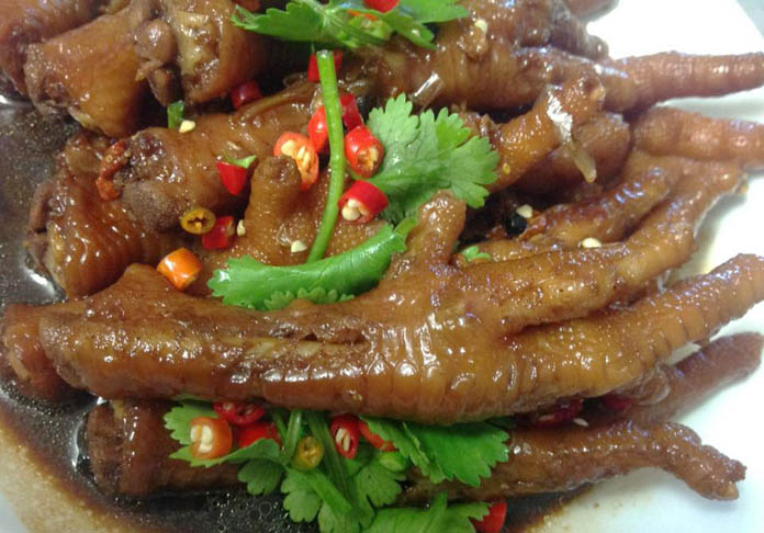 គ្រឿងផ្សំ៖ ជើងមាន់ ១គីឡូ, ទឹក ៥កូនចានចង្កឹះ, ខ្ទឹមស និងម្រេចបុកចូលគ្នា ១ស្លាបព្រាបាយ, ស្ករត្នោត ៨ស្លាបព្រាបាយ, ទឹកត្រី ៤ស្លាបព្រាបាយ, ទឹកស៊ីអ៊ីវខាប់ ២ស្លាបព្រាបាយ។ គ្រឿងផ្សំទឹកជ្រលក់៖ ម្ទេស ៥-៧គ្រាប់, ខ្ទឹមស ៤កំពឹស, ទឹកក្តៅ ២ស្លាបព្រាបាយ, ទឹកត្រី ២ស្លាបព្រាបាយ, ស្ករស ១ស្លាបព្រាបាយ, ទឹកក្រូចឆ្មារ ៥ស្លាបព្រាបាយ។