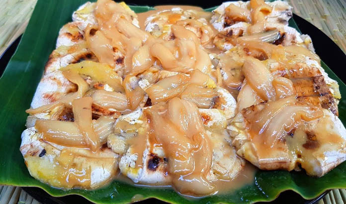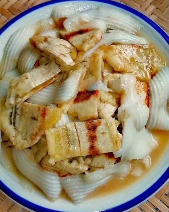 គ្រឿងផ្សំ៖ ចេកណាំវ៉ា ១ស្និត, ស្ករត្នោត ១១៥ក្រាម, ស្ករស ៦០ក្រាម, អំបិល កន្លះស្លាបព្រាកាហ្វេ, ខ្ទិះដូង ១កូនចានចង្កឹះ, សរសៃសាច់ដូងខ្ចី កន្លះកូនចានចង្កឹះ, ស្លឹកតើយ ២សន្លឹក។