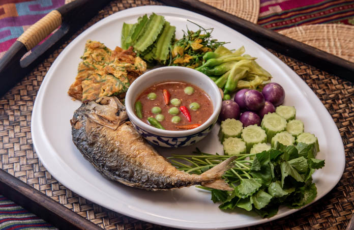 គ្រឿងផ្សំ៖ កាពិ ៣ស្លាបព្រាបាយ, បង្គាក្រៀម ២ស្លាបព្រាបាយ (ដាក់ ឬមិនដាក់ក៏បាន), ត្រប់ពុតលំញង ម្ទេសស្រស់ ខ្ទឹមស ខ្ទឹមក្រហម (ដាក់តាមចំណូលចិត្ត), ទឹកក្រូចឆ្មារ ៤-៥ស្លាបព្រាបាយ, ស្ករ ២ស្លាបព្រាបាយ, ទឹកត្រី ២ស្លាបព្រាបាយ, បន្លែអន្លក់មាន ស្ពៃក្តោប ត្រសក់ ត្រប់ ពោតបារាំង ការ៉ុត…, ត្រីប្លាធូ, ពងទាចៀនស្អំ។