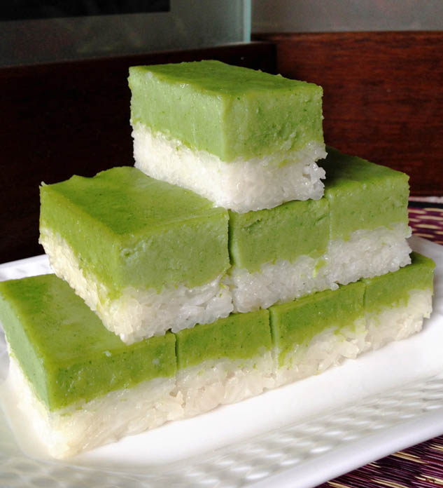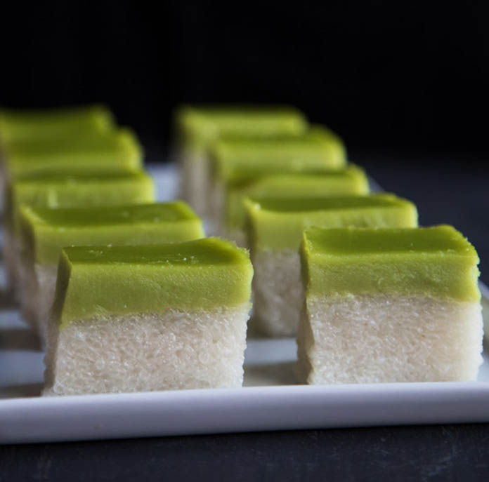 គ្រឿងផ្សំ៖ អង្ករដំណើប ៤០០ក្រាម (លាងឲ្យស្អាត ត្រាំទឹកចោល១យប់), ខ្ទិះដូង ១៥០មីលីលីត្រ, ទឹក ១០០មីលីលីត្រ, អំបិល ១ស្លាបព្រាកាហ្វេ, ស្លឹកតើយ ៣សន្លឹក។ គ្រឿងផ្សំសង់ខ្យា៖ ទឹកស្លឹកតើយ ១៥០មីលីលីត្រ (ស្លឹកតើយ ១០សន្លឹក កិនជាមួយទឹក ២០០មីលីលីត្រ), ខ្ទិះដូង ២០០មីលីលីត្រ, ម្សៅពោតសម្រាប់ធ្វើនំ(corn flour) ៥ស្លាបព្រាបាយ, ម្សៅសម្រាប់ធ្វើនំ(all purpose flour) ៣ស្លាបព្រាបាយ, ស៊ុត ៣គ្រាប់ (យកតែពងក្រហម), ស្ករស ១៤០ក្រាម ។