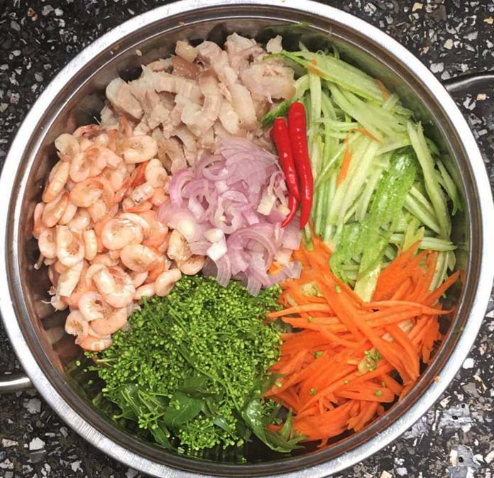 ២.ស្តៅយកស្រុះឲ្យឆ្អិនបេះតូចៗ ស្ពៃក្តោប ប៉េងប៉ោះ ត្រសក់ និងការ៉ុត ហាន់ជាសរសៃស្តើងៗល្មម