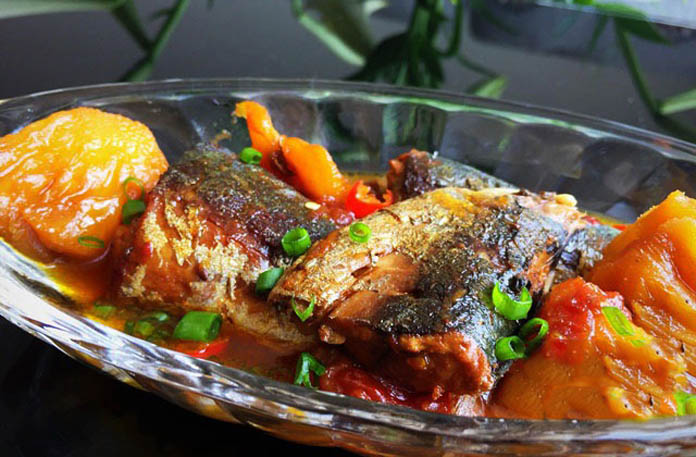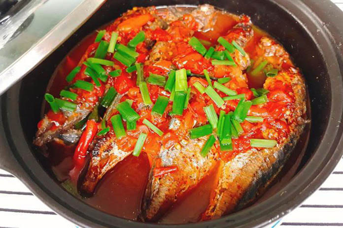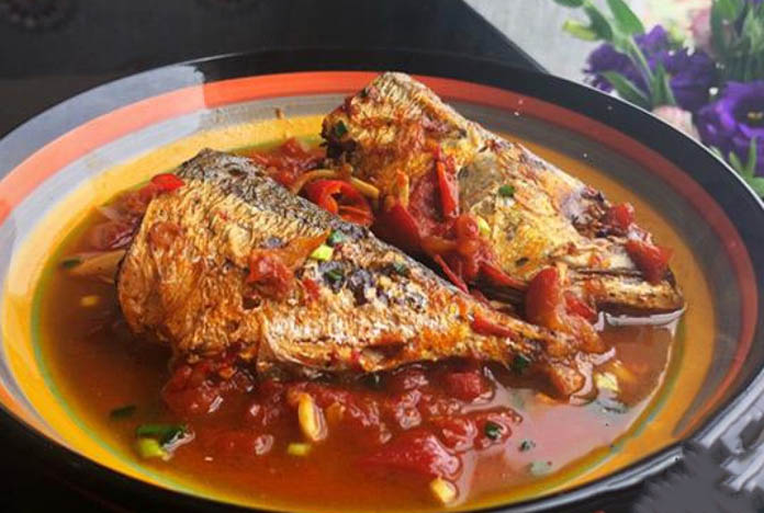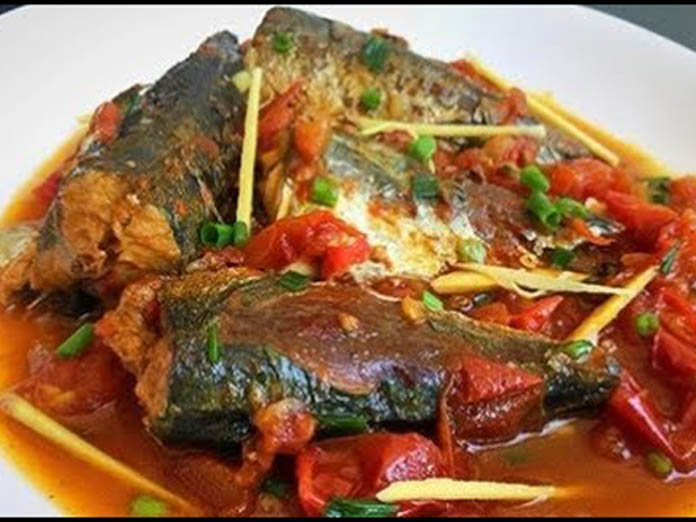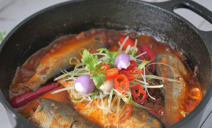 គ្រឿងផ្សំ៖ ត្រី ៨០០ក្រាម ធ្វើឲ្យស្អាត,ប៉េងប៉ោះ ២ផ្លែ,ខ្ទឹមស៣កំពឹស,ខ្ទឹមក្រហម ៣កំពឹស,គល់ស្លឹកខ្ទឹម។ គ្រឿងប្រឡាក់ត្រី៖ អំបិល ១ស្លាបព្រាកាហ្វេ,ទឹកប្រេងខ្យង ១ស្លាបព្រាកាហ្វេ,ម្រេចម៉ត់បន្តិច។ គ្រឿងធ្វើទឹកខ៖ ស្ករត្នោត ១ស្លាបព្រាបាយ,ប្រេងឆា ១ស្លាបព្រាបាយ,ទឹកត្រី ៣ស្លាបព្រាបាយ,ទឹកប៉េងប៉ោះ ៤ស្លាបព្រាបាយ,អំបិល ១ស្លាបព្រាកាហ្វេ,ម្រេចម៉ត់ ១ស្លាបព្រាកាហ្វេ,ទឹកប្រេងខ្យង ១ស្លាបព្រាកាហ្វេ,ម្ទេសហុយ (តាមចំណូលចិត្ត),ម្ទេសក្រៀម (តាមចំណូលចិត្ត ឬមិនដាក់ក៏បាន),ទឹក ៣០០មីលីលីត្រ។
