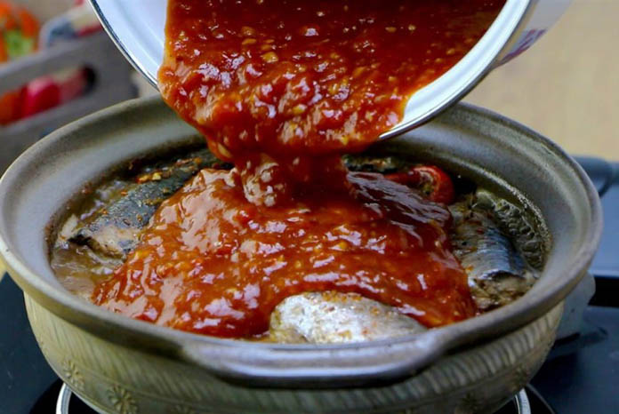 ៣.ដាំឆ្នាំងដាក់ស្ករត្នោតចូលកូរឲ្យរលាយស្ករ រួចដាក់ប្រេងឆា ខ្ទឹមសចិញ្រ្ចាំ និងខ្ទឹមប្រហមចិញ្រ្ចាំចូលច្របល់ចូលគ្នាឲ្យសព្វ ហើយដាក់ទឹកត្រី ទឹកប៉េងប៉ោះ អំបិល ម្រេចម៉ត់ ទឹកប្រេងខ្យង និងម្ទេសហុយចូលច្របល់ចូលគ្នា រួចដាក់ប៉េងប៉ោះចូលច្របល់តិចៗចូលគ្នាឲ្យសព្វឲ្យពុះ ហើយដាក់ម្ទេសក្រៀមចូល និងចាក់ទឹកចូលកូរចូលគ្នាឲ្យសព្វ ទុកឲ្យពុះ