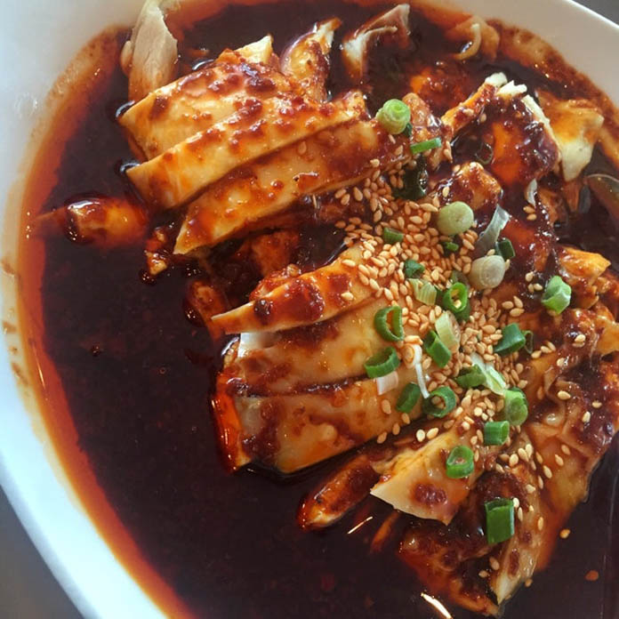 ៣.បន្ទាប់មកយកមាន់កាប់ជាដុំធំៗល្មម រៀបដាក់ចានសំរាប់ទទួលទាន រួចយកគ្រឿងដែលលាយហើយស្រោចចូលពីលើសាច់មាន់ ហើយដាក់សណ្តែកដីលីង ល្ងស និងជីវ៉ាន់ស៊ុយ ឬស្លឹកខ្ទឹមពីលើជាការស្រេច៕