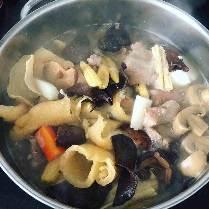 គ្រឿងផ្សំ៖ ឆ្អឹងជំនី ឬសាច់មាន់ ៥០០ក្រាមកាប់ជាដុំៗល្មម,ស្បែកជ្រូក ២០០ក្រាមកាត់ជាដុំៗ,ត្រចៀកកណ្តុរ ១៥០ក្រាមកាត់ជាដុំ,ពពុះសណ្តែក ១៥០ក្រាមកាត់រាងវែងបន្តិច,ស្ពៃក្តោប ៣០០ក្រាមកាត់ជាដុំ,ការ៉ុត ១មើមចិតជាដុំ,អំបិល ១ស្លាបព្រាកាហ្វេ,ស្ករស កន្លះស្លាបព្រាបាយ,ខ្ទឹមសចិញ្រ្ចាំ ៤កំពឹស,ទឹកត្រី ២-៣ស្លាបព្រាបាយ,ហ៊ាប៊ីយាហ៊ឺ ១៥០ក្រាម,អាចបន្ថែមបន្លែដូចជា ឆៃថាវ ខាត់ណា (តាមចំណូលចិត្ត),ប្រេងឆា ៣-៥ស្លាបព្រាបាយ, ទឹកធម្មតា ឬទឹកស្ងោរមាន់(បើមានយកមកស្លរកាន់តែឆ្ងាញ់),ស្លឹកខ្ទឹមហាន់។