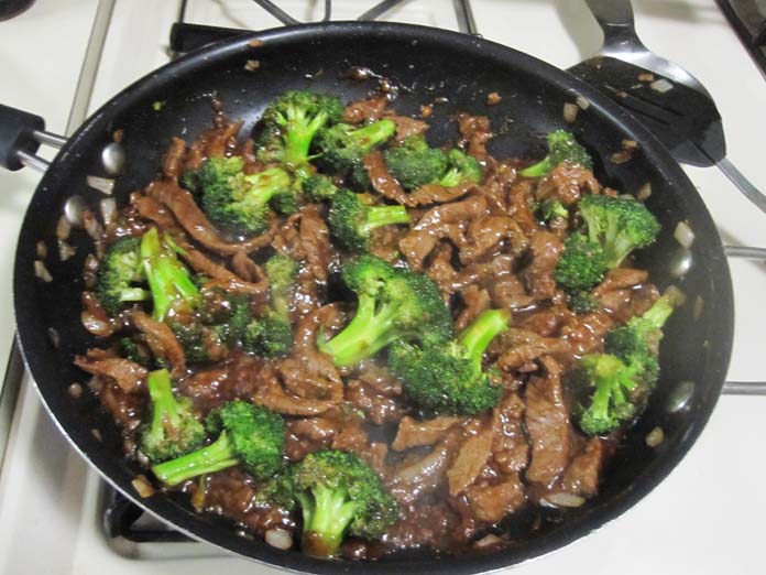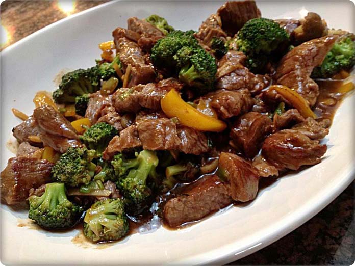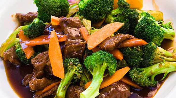 គ្រឿងផ្សំ៖ សាច់គោ ២០០ក្រាមហាន់ស្តើងល្មម,ផ្កាខាត់ណាខៀវ ២០០ក្រាម,ការ៉ុត ៣០ក្រាម,ខ្ទឹមបារាំង ពាក់កណ្តាល,ទឹកប្រេងខ្យង ២ស្លាបព្រាបាយ,ទឹកស៊ីអ៊ីវ កន្លះស្លាបព្រាបាយ,ស្ករស កន្លះស្លាបព្រាបាយ,ប្រេងល្ង ១ស្លាបព្រាកាហ្វេ,ខ្ទឹមសចិញ្រ្ចាំ។