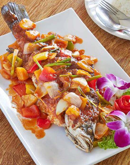 គ្រឿងផ្សំ៖ ត្រី ១ក្បាលល្មម,ម្នាស់ ប៉េងប៉ោះ ការ៉ុត ខ្ទឹមបារាំង និងម្ទេសផ្លោក ហាន់ជាចំណិតៗ ឬហាន់ល្អិតៗ (តាមចំណូលចិត្ត),ទឹកត្រី ១ស្លាបព្រាបាយ,ទឹកស៊ីអ៊ីវ ១ស្លាបព្រាបាយ,ទឹកប៉េងប៉ោះ ១ស្លាបព្រាបាយ,ស្ករ ១ស្លាបព្រាបាយ,ទឹកម្ទេស ២ស្លាបព្រាបាយ,ម្សៅបំពង ១ស្លាបព្រាបាយ,ខ្ទឹមសចិញ្ច្រាំ ២ស្លាបព្រាបាយ,ស្លឹកខ្ទឹមហាន់។