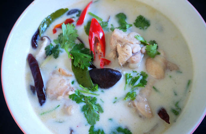 ១.ដាំឆ្នាំងដាក់ទឹក និងខ្ទិះដូងចូលដាំឲ្យពុះ រួចដាក់គល់ស្លឹកគ្រៃ រំដេង និងស្លឹកក្រូចសើចចូល ហើយដាក់សាច់មាន់ និងផ្សិតចូលរម្ងាស់ឲ្យពុះ