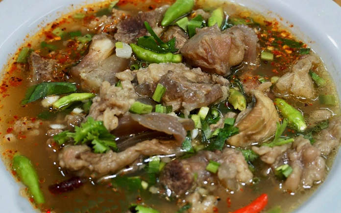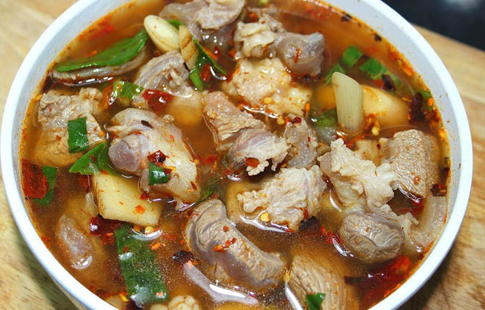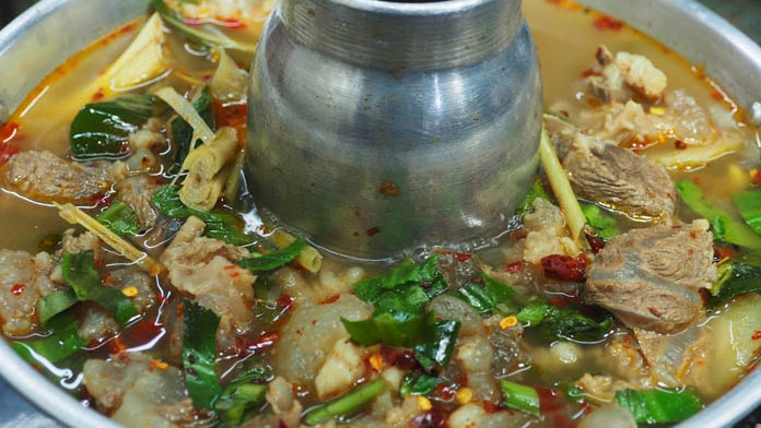 គ្រឿងផ្សំ៖ សាច់គោ(សាច់ជាប់ខ្លាញ់)ហាន់ស្តើងល្មម ១កូនចានចង្កឹះ,ប៉េងប៉ោះ ១-២ផ្លែ ហាន់ជាចំណិត(មិនដាក់ក៏បាន),គល់ស្លឹកគ្រៃ រំដេង ខ្ទឹមក្រហម,ម្ទេសហុយ ១ស្លាបព្រាបាយ,អង្ករលីង ២ស្លាបព្រាបាយ,ទឹកត្រី ៣ស្លាបព្រាបាយ,អំបិលបន្តិច,ទឹកក្រូចឆ្មារ ២ស្លាបព្រាបាយ,ម្ទេស(ដាក់តាមចំណូលចិត្ត),ស្លឹកក្រូចសើច,ស្លឹកខ្ទឹម និងស្លឹកជីររណា ហាន់,ទឹក ២កូនចានចង្កឹះ។
