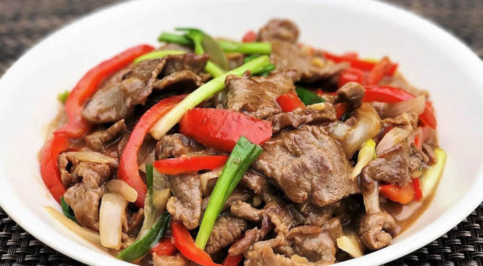 គ្រឿងផ្សំទី១៖ សាច់គោហាន់ស្តើងៗល្មម ៣០០ក្រាម,ទឹកប្រេងខ្យង ២ស្លាបព្រាបាយ,ប្រេងល្ង ១ស្លាបព្រាកាហ្វេ,ម្សៅឆា ១ស្លាបព្រាបាយ,ទឹក ៤ស្លាបព្រាបាយ(គ្រឿងផ្សំសម្រាប់ប្រឡាក់ជាមួយសាច់)។ គ្រឿងផ្សំទី២៖ ប្រេងឆា ២ស្លាបព្រាបាយ,ខ្ទឹមចិញ្ច្រាំ ២ស្លាបព្រាបាយ,ទឹកប្រេងខ្យង ២ស្លាបព្រាបាយ,ទឹកស៊ីអ៊ីវ ២ស្លាបព្រាកាហ្វេ,ស្ករស ១ស្លាបព្រាកាហ្វេ,បន្លែមាន ខ្ទឹមបារាំង ម្ទេសប្លោក និងស្លឹកខ្ទឹម។
