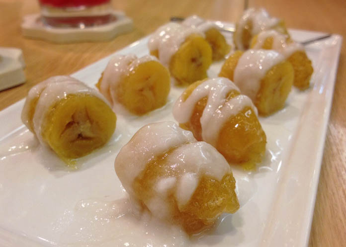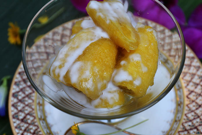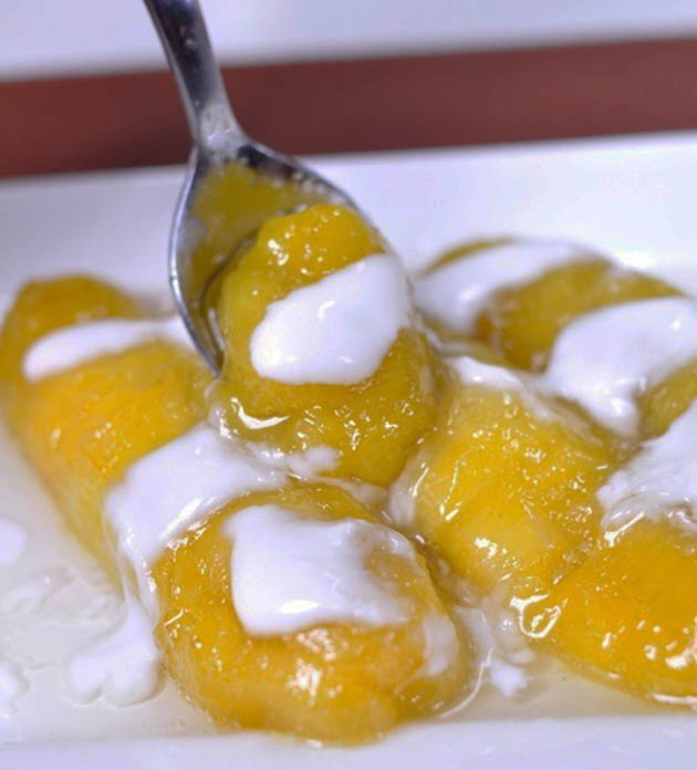 ៤.ពេលហូបយកចេកដែលឆឹងដាក់ចាន ហើយស្រោចទឹកខ្ទិះចូលពីលើជាការស្រេច៕ ចុចមើលវីដេអូពីវិធីធ្វើនៅខាងក្រោម៖