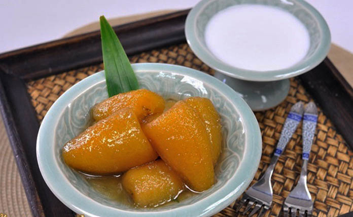 ២.ដាំឆ្នាំងដាក់ទឹកចូល ដាក់ស្ករស និងស្លឹកតើយចូលកូរឲ្យចូលរលាយស្ករសព្វល្អ ហើយស្រង់ចេកដាក់ចូល ច្របាច់ក្រូចឆ្មារចូលបន្តិចកូរឲ្យសព្វចូលគ្នា។