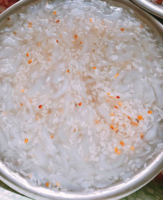 ២.ដាំឆ្នាំងដាក់ទឹកចូលដាំឲ្យពុះ រួចដាក់អង្ករដំណើបចូលកូរឲ្យសព្វ ទុករហូតគ្រាប់អង្កររីកហើយទន់