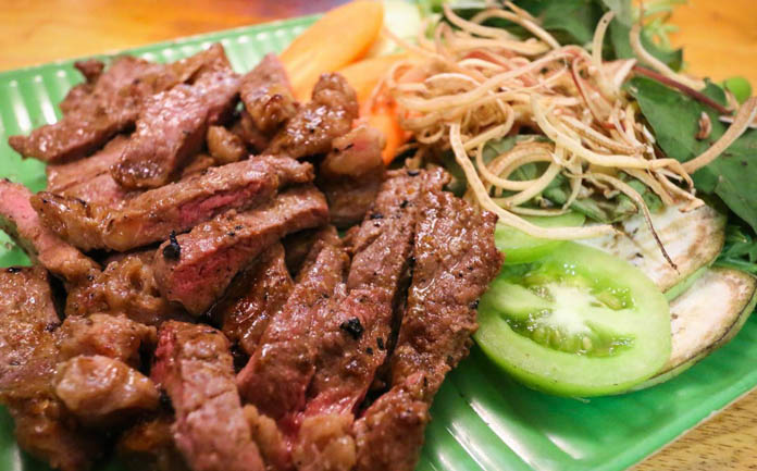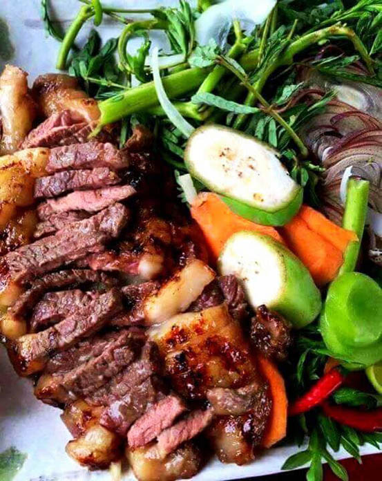 ៣.បន្ទាប់មកយកសាច់គោដែលប្រឡាក់ហើយដាក់អាំងឲ្យឆ្អនល្មមតាមចំណូលចិត្ត ឆ្អិនហើយយកសាច់មកហាន់ដាក់ចាន