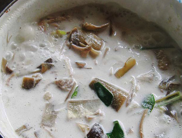 គ្រឿងផ្សំ៖ សាច់មាន់ កន្លះគីឡូ(កាប់ជាដុំៗល្មម),ទឹក ៨០០មីលីលីត្រ,ដុំស៊ុប ១ដុំ,ត្រយ៉ូង ១ផ្លែល្មម កាត់ជាដុំៗល្មម,ខ្ទិះដូង ៨០០មីលីលីត្រ,រំដេង គល់ស្លឹកគ្រៃ ស្លឹកក្រូចសើច និងម្ទេសហាន់,ទឹកត្រី ១ស្លាបព្រាបាយកន្លះ,ស្ករស ១ស្លាបព្រាកាហ្វេ,អំបិល ១ចុងស្លាបព្រាកាហ្វេ,ក្រូចឆ្មារ និងជីរស្ងោរជ្រក់ (ដាក់តាមចំណូលចិត្ត)។