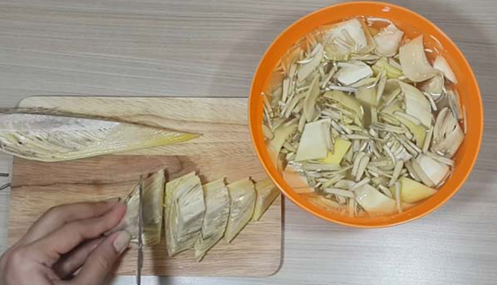 ៣.រួចហើយដាក់ខិ្ទះដូងចូល ដាក់ត្រយ៉ូងចេកចូលកូរចូលគ្នា ឆ្អិនហើយដាក់ស្លឹកក្រូចសើចចូល ហើយដួសដាក់ចាន ច្របាច់ក្រូចឆ្មារ និងដាក់ជីរចូលជាការស្រេច៕
