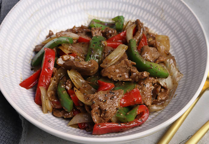 គ្រឿងផ្សំទី១៖ សាច់គោ ៣០០ក្រាមហាន់ស្តើងៗល្មម,ទឹកប្រេងខ្យង ២ស្លាបព្រាបាយ,ប្រេងល្ង ១ស្លាបព្រាកាហ្វេ,ម្សៅឆា ១ស្លាបព្រាបាយ,ទឹក ៤ស្លាបព្រាបាយ(គ្រឿងផ្សំសម្រាប់ប្រឡាក់ជាមួយសាច់)។ គ្រឿងផ្សំទី២៖ ប្រេងឆា ២ស្លាបព្រាបាយ,ខ្ទឹមចិញ្ច្រាំ ២ស្លាបព្រាបាយ,ទឹកប្រេងខ្យង ២ស្លាបព្រាបាយ,ទឹកស៊ីអុីវ ២ស្លាបព្រាកាហ្វេ,ស្ករស ១ស្លាបព្រាកាហ្វេ,បន្លែមាន ខ្ទឹមបារាំង ម្ទេសប្លោក និងស្លឹកខ្ទឹម ឬតាមចំណូលចិត្ត។