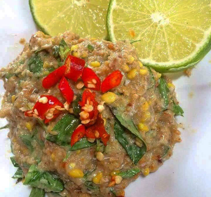 ១.យកប្រហុកមកចិញ្ច្រាំឲ្យម៉ត់ល្អ រួចដាក់ក្រសាំង ម្ទេស ខ្ទឹមស និងគល់ស្លឹកគ្រៃចូលចិញ្ច្រាំចូលគ្នាឲ្យសព្វល្អ