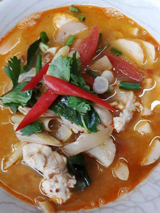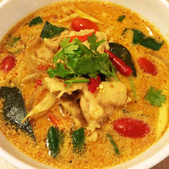 គ្រឿងផ្សំ៖ សាច់មាន់ ៣០០ក្រាម,ផ្សិត(ផ្សិតចំបើង ឬផ្សិតស) ១៥០ក្រាម,ប៉េងប៉ោះ ១-២ផ្លែហាន់ជាចំណិត,រំដេង គល់ស្លឹកគ្រៃ ស្លឹកក្រូចសើច និងម្ទេស,ម្ទេសឆា ៨០ក្រាម,ទឹកដោះគោស្រស់ ១៥០ក្រាម,ទឹកត្រី ៣ស្លាបព្រាបាយ,ទឹកក្រូចឆ្មារ ៣ស្លាបព្រាបាយ,ម្ទេសក្រៀម និងស្លឹកជីរណាហាន់,ទឹក ៥០០មីលីលីត្រ។