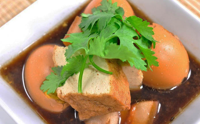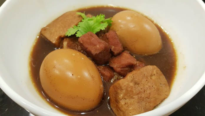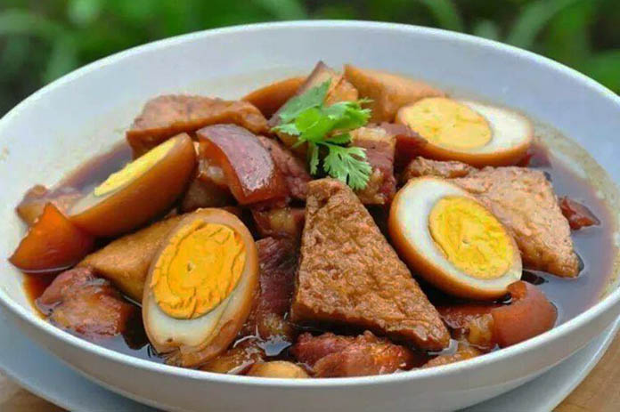 គ្រឿងផ្សំ៖ សាច់ជ្រូកបីជាន់ ៦០០ក្រាម ហាន់ជាដុំៗល្មម,ស៊ុត ៥-៧គ្រាប់,តៅហ៊ូដុំ ២០០ក្រាម,ខ្ទឹមសចិញ្រ្ចាំ ១០កំពឹស និងម្រេចបន្តិច (បុកចូលគ្នា),អំបិល កន្លះស្លាបព្រាកាហ្វេ,ស្ករត្នោត ៥ស្លាបព្រាបាយ,ទឹកត្រី ៦-៨ស្លាបព្រាបាយ,ទឹកស៊ីអ៊ីវខាប់ ១ស្លាបព្រាបាយ (ដាក់ ឬមិនដាក់ក៏បាន),ទឹក ១លីត្រ។